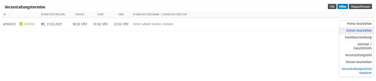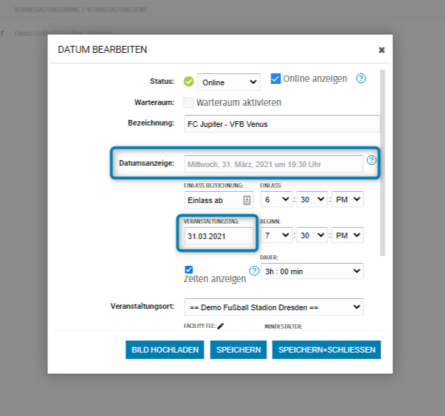 Achtung! Diese Änderung überschreibt nur die Darstellung im Ticketshop, ändert aber nicht das eigentliche Datum der Veranstaltung.