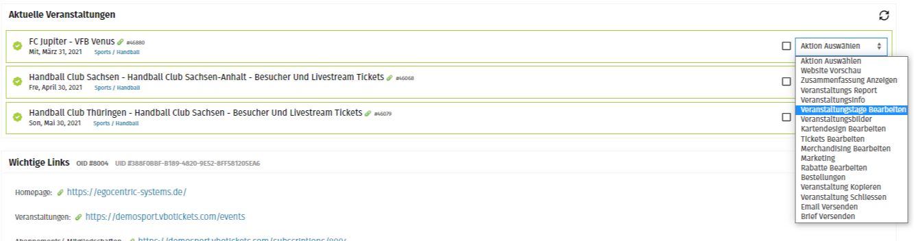 Gehe zu "Veranstaltungen" und suche nach der Veranstaltung, die Du bearbeiten möchtest. Wähle dann unter der Veranstaltung bei "Aktion Auswählen" >> "Veranstaltungstage Bearbeiten" aus.