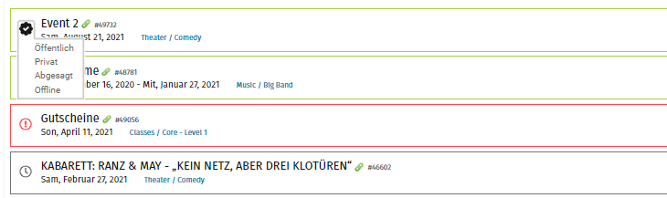 Um den Status einer Veranstaltung zu ändern, gehe bitte zu Veranstaltungen >> Aktuelle Veranstaltungen. Hier findest du bei jeder Veranstaltung auf der linken Seite ein Symbol zum Status der jeweiligen Veranstaltung und die Veranstaltungen sind je nach Status in einer anderen Farbe markiert. Indem Du auf das Symbol klickst, kannst Du den entsprechenden Status auswählen.