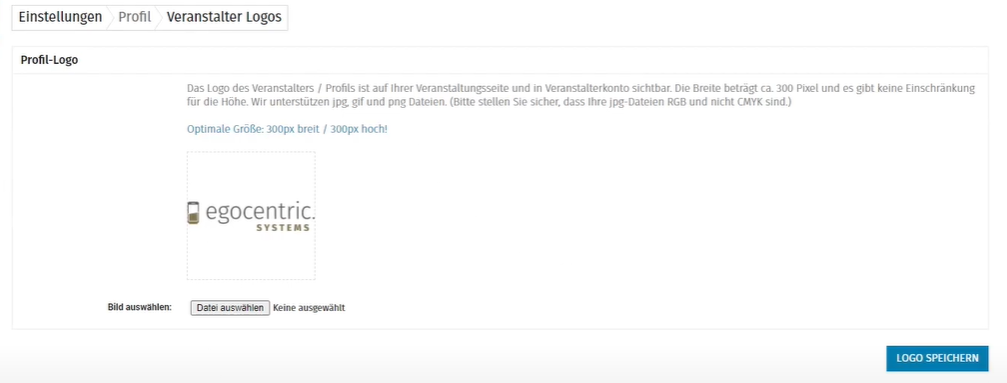 Profillogo: Sichtbar auf Deiner Veranstaltungsseite und im Veranstalterkonto. Es sollte ca. 300 Pixel breit sein und kann als JPG, GIF oder PNG hochgeladen werden. Achte darauf, dass JPG-Dateien im RGB-Format vorliegen.