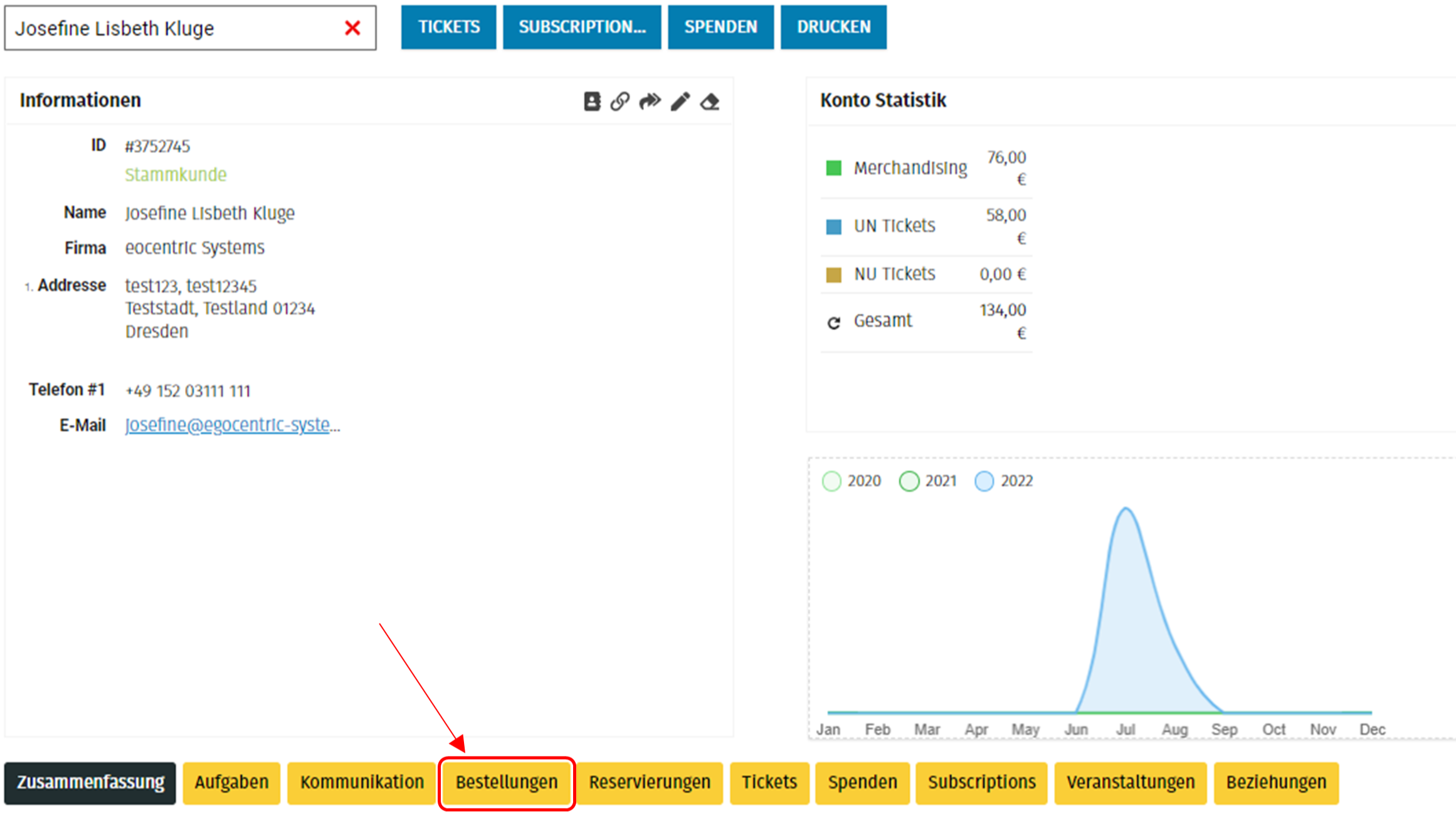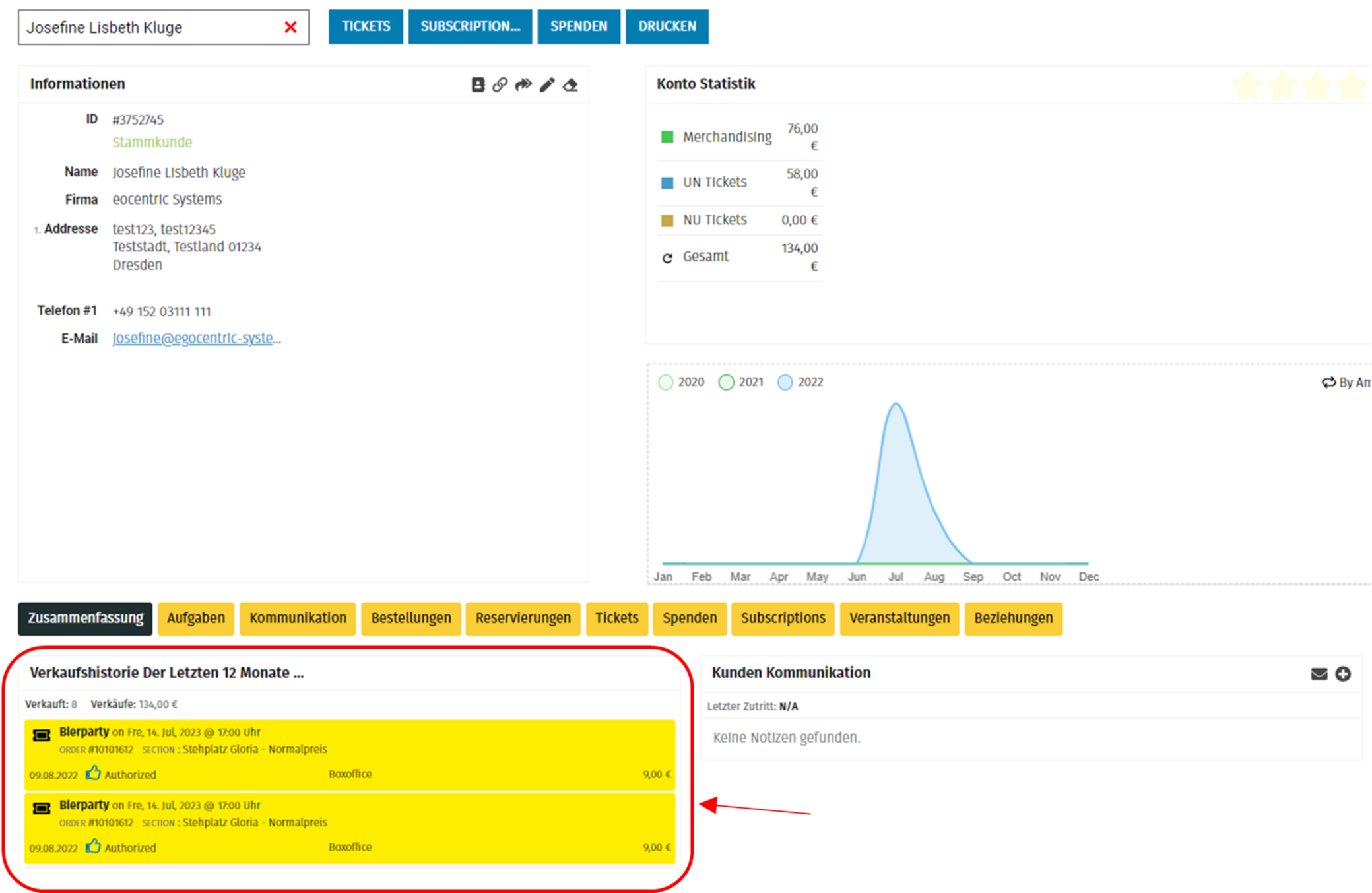 2. Nun erscheint die Verkaufshistorie, in der du sehen kannst, welche Tickets der Kunde in den letzte 12 Monaten gekauft hat.