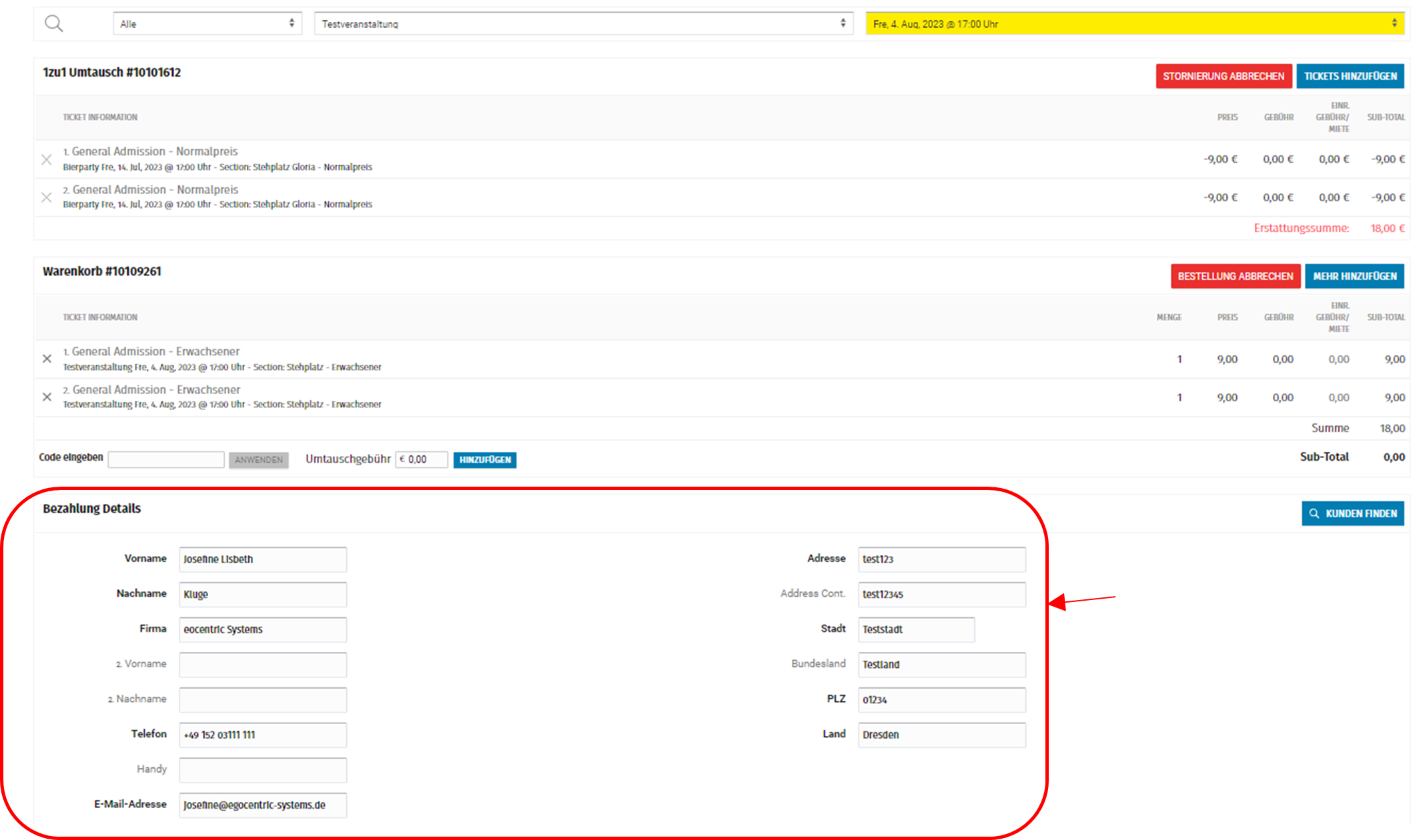 8. Du siehst jetzt die stornierten Tickets, sowie die neuen Tickets und die Bezahlungsdetails.