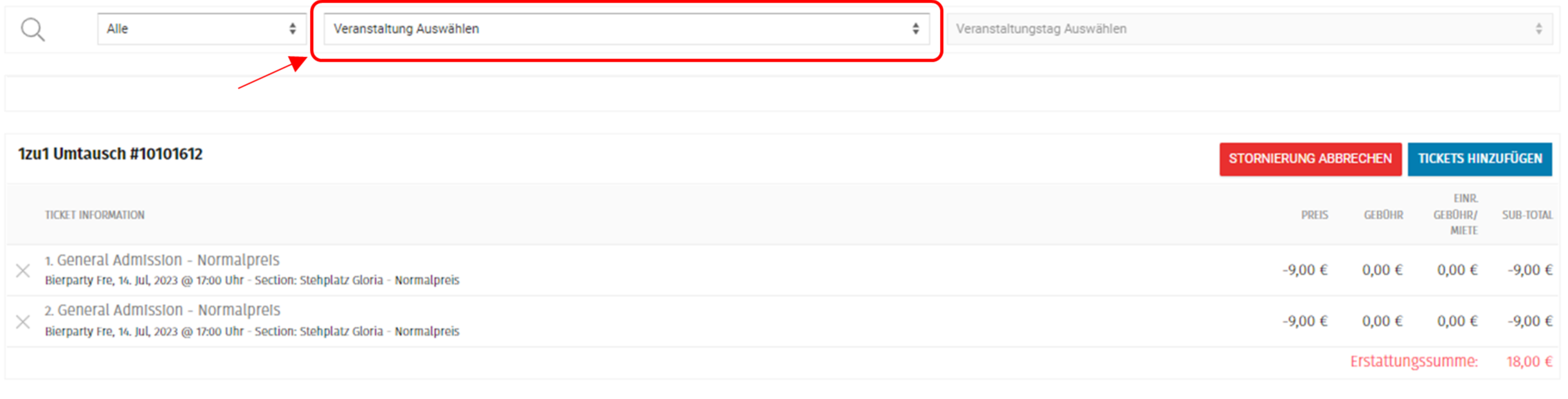 6. Du kannst nun die neue Veranstaltung wählen, auf die der Kunde seine Tickets umbuchen möchte.
