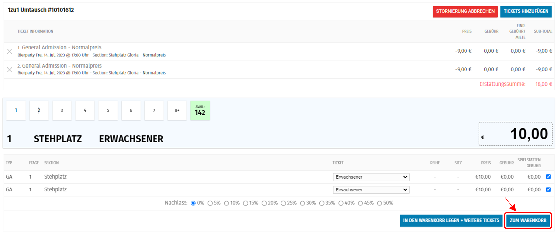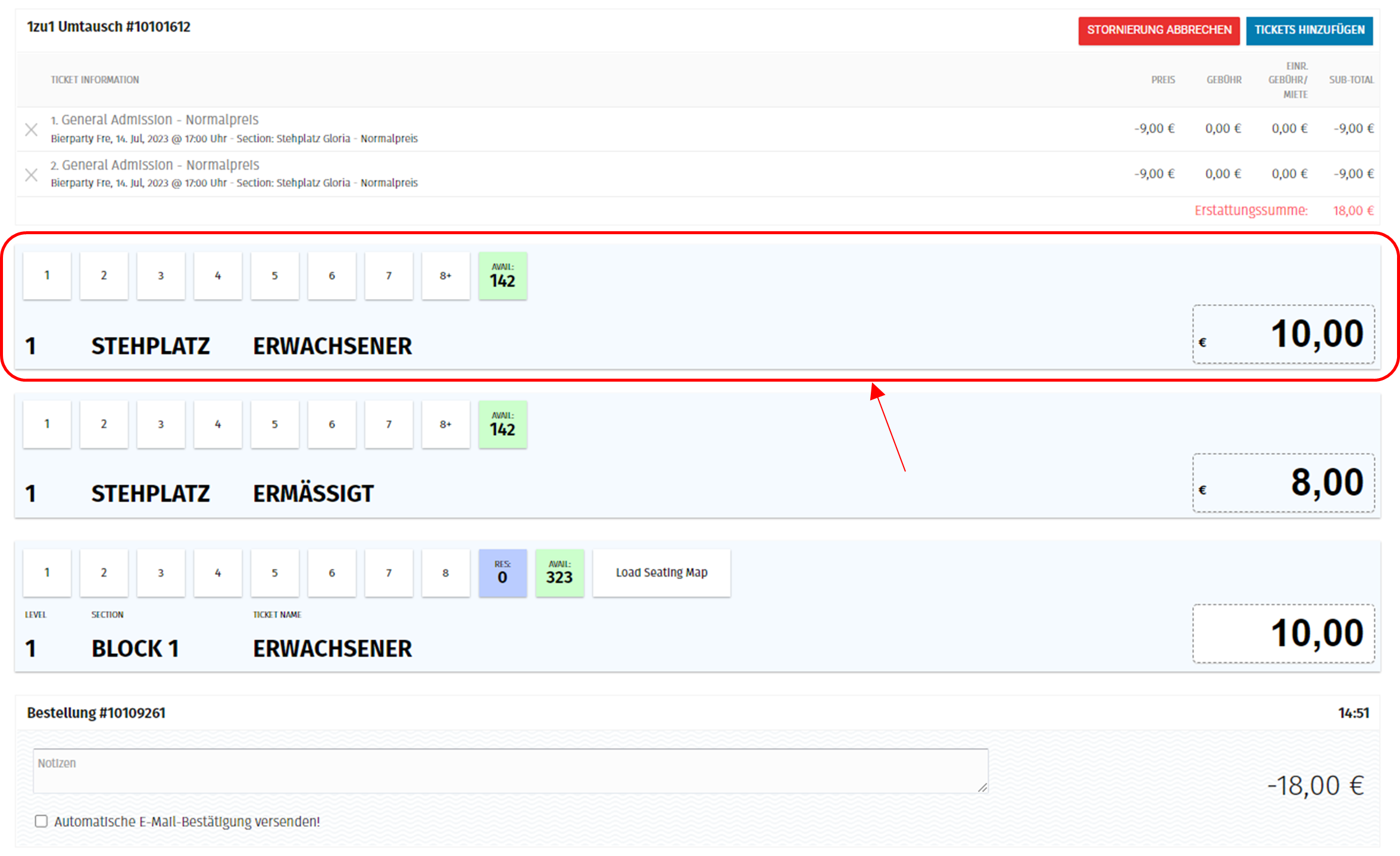 Wenn du die Tickets 1 zu 1 umtauschst, werden diese für den gleichen Preis verkauft. Es gibt die Möglichkeit, Tickets nur umzutauschen. Die übergebliebene Summe, entweder Storno oder Restkosten, werden dem Kunden dann über seine vorher gewählte Zahlungsart in Rechnung gestellt, oder zurücküberwiesen.
