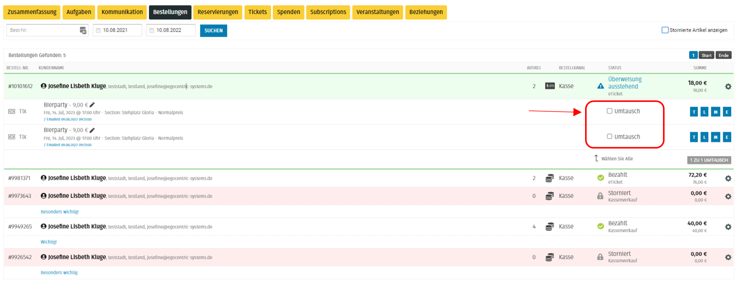 4. Anschließend siehst du die Bestellungen des Kunden nochmal im Detail. Du wählst die Buchung aus, die du umtauschen möchtest und die Kartendetails erscheinen.