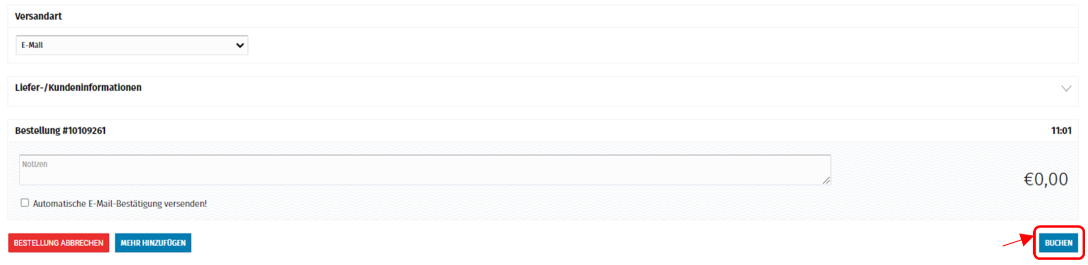 9. Wenn du nach unten scrollst, siehst du die vom Kunden gewählte Versandart und klickst wie gewohnt auf BUCHEN.