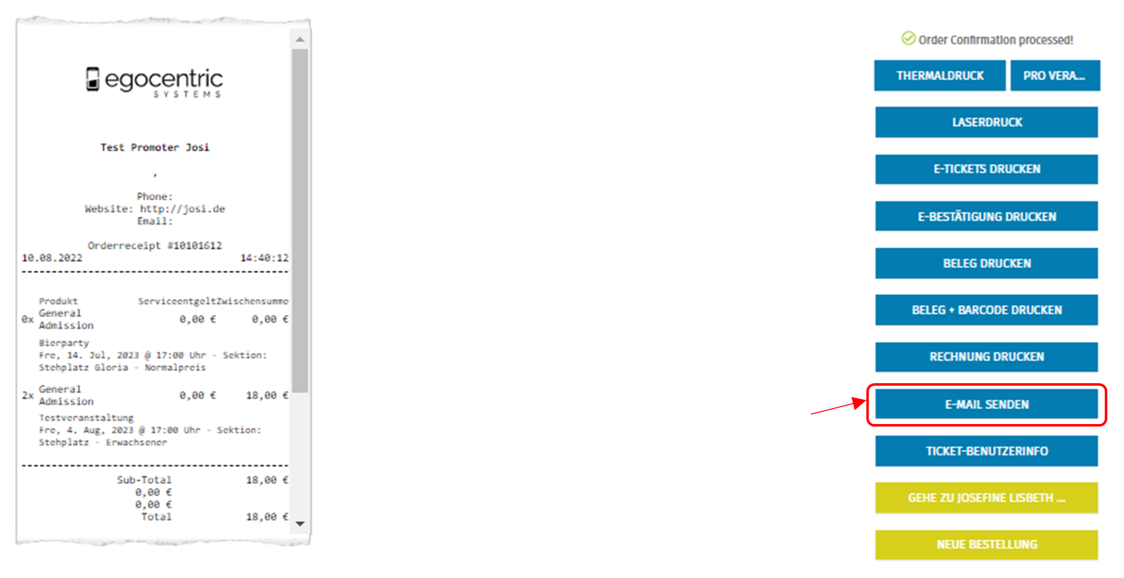 11. Wenn du keine automatische E-Mail – Bestätigung versendet hast, musst du dies noch manuell tun. Dafür klickst du neben der Quittungsmaske auf E- MAIL SENDEN und der Kunde bekommt dann die neuen Tickets und die Details per Mail zugeschickt.