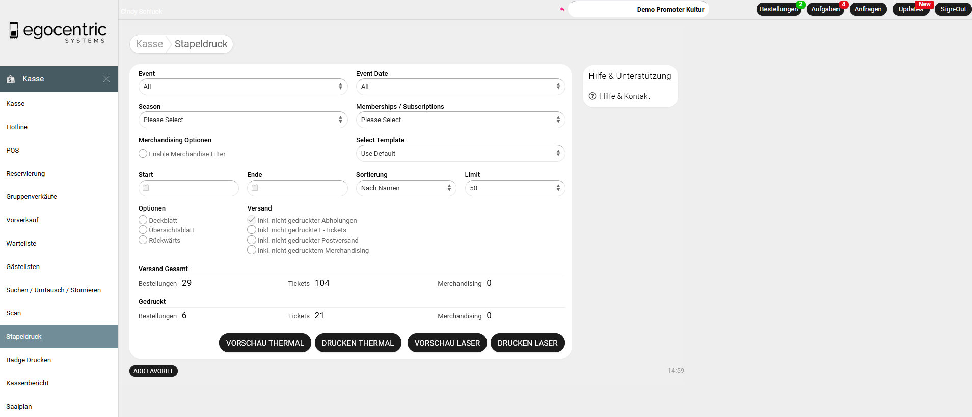 Melde Dich im Eventmanager an und gehe über den Menüpunkt Kasse zu Stapeldruck.