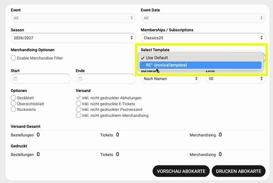 Mit der Auswahl von Templates kannst Du neben Tickets auch Deine Rechnungen ausdrucken. Unter "RE" (InvoiceTemplate)" findest Du voreingestellt die Vorlage für den zusätzlichen Druck der Rechnungen.
