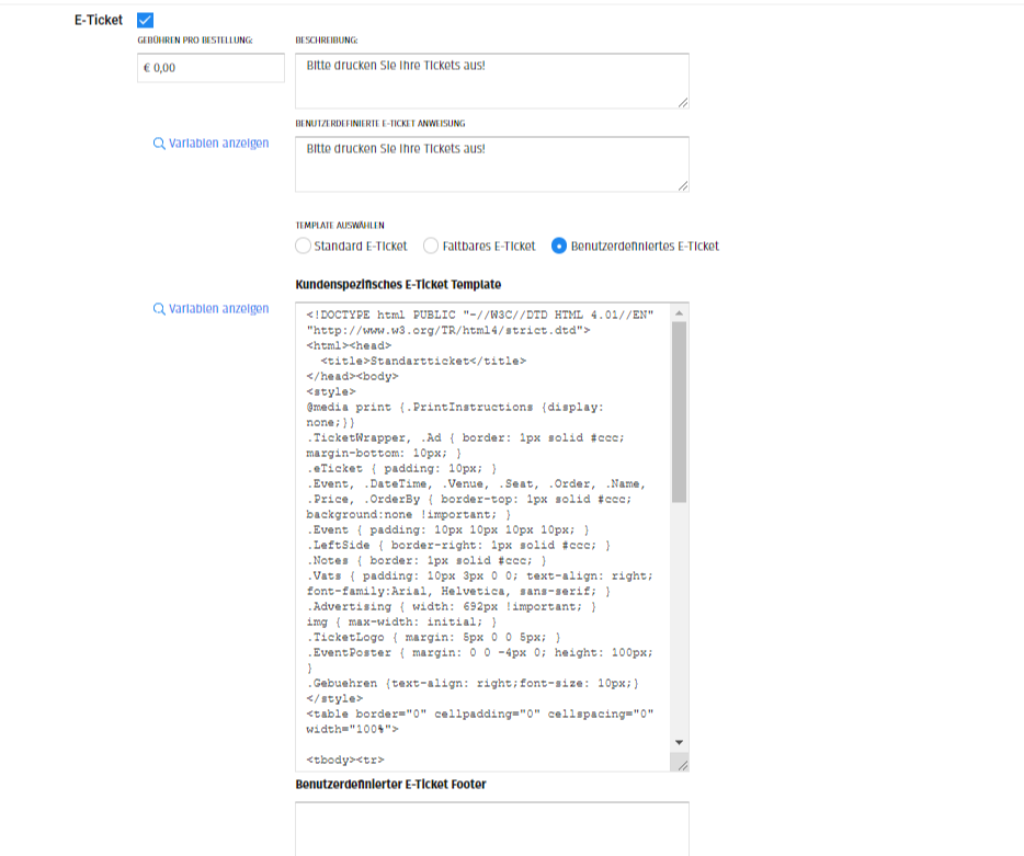 Unter "Einstellungen" >> "Veranstaltungen" >> "Lieferungseinstellungen" findest Du den Abschnitt E-Ticket. Wenn Du hier von Standard E-Ticket auf Benutzerdefiniertes E-Ticket umschaltest erhältst Du ein Feld in dem du das HTML-Layout eintragen kannst. (siehe unten)