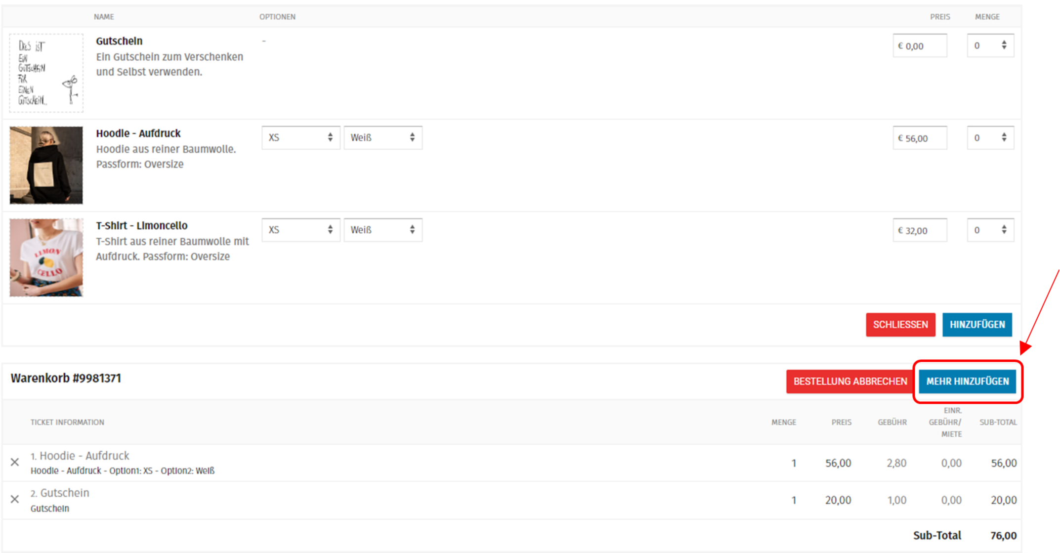 Du befindest dich jetzt im Warenkorb. Wenn du doch noch weitere Artikel buchen möchtest, kannst du auf MEHR HINZUFÜGEN klicken und du wirst in die vorherige Ansicht weitergeleitet und kannst dann beispielsweise für Veranstaltungen Tickets buchen. Du kannst aber auch in der aktuellen Ansicht bleiben und wie gewohnt die Merchandising Artikel auswählen.