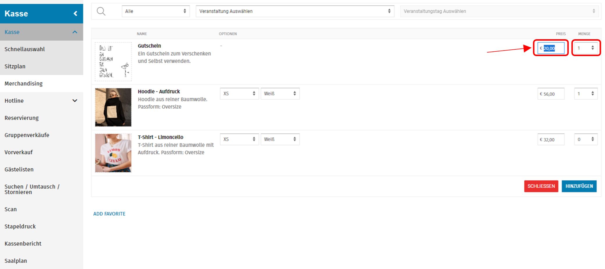Du kannst nun einfach auswählen, welche Artikel du benötigst. Bei einem Gutschein setzt du in das Feld unter Preis einfach den gewünschten Betrag. In dem Feld unter Menge wählst du die Anzahl der Produkte aus.
