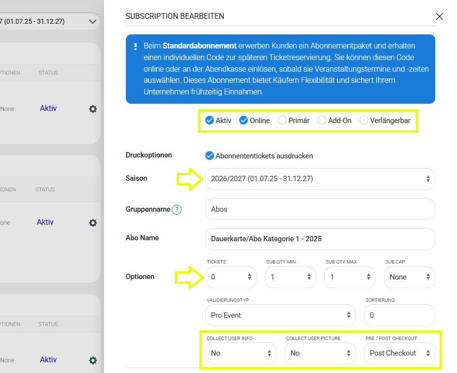 - Saisonübernahme bestehender Abos/Dauerkarten aktivieren