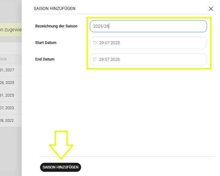 5. Definiere den Zeitraum der Saison, indem Du ein Start- und ein Enddatum angibst.