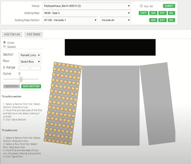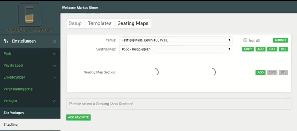 - Veranstaltungsstätte und Sitzplan anlegen: Wähle Deine Veranstaltungsstätte aus, erstelle neue Säle und Sitzblöcke nach Deinen Anforderungen.