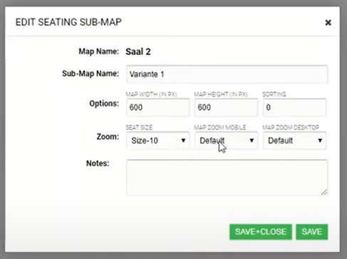 Sobald der Saal angelegt ist, kannst Du den Sitzplan erstellen. Wähle die Zoomstufe und definiere die Größe des Plans (z. B. 600 x 600 Pixel). Lade ein passendes Hintergrundbild hoch, das mit den Maßen übereinstimmt. Auf diesem Bild kannst Du alle relevanten Details wie Treppen, Rollstuhlplätze oder Ausgänge markieren. Danach fügst Du die gewünschten Sitzblöcke hinzu, z. B. „Parkett links“, und bestimmst, wie viele Reihen und Sitze pro Block vorhanden sind.