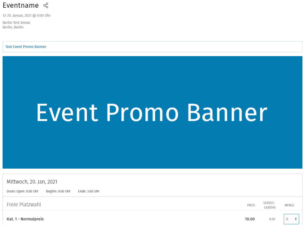 Dieser Banner wird oberhalb der Ticketauswahl auf der Veranstaltungsseite angezeigt. Hier kannst du neben einem Bild auch noch Texte hinterlegen.