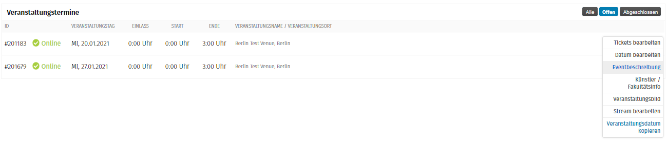 Wechsel dazu in deiner Veranstaltung zu dem Menüpunkt Veranstaltungstage und wähle dort bei dem entsprechenden Veranstaltungstag über das Zahnrad den Punkt Eventbeschreibung aus.