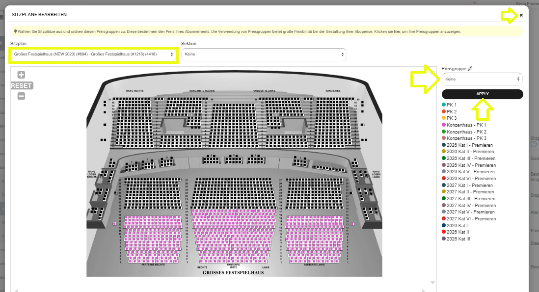 7.5 Wiederhole den Prozess mit allen in der Dauerkarte/im Theater-Abo verfügbaren Plätze und Kategorien.