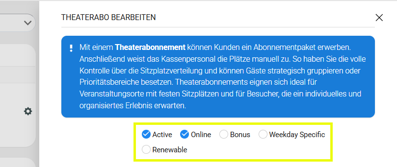 | Was? | Lerne, wie Du Theaterabonnements/Dauerkarten einrichtest. Inhalte in diesem Artikel:
