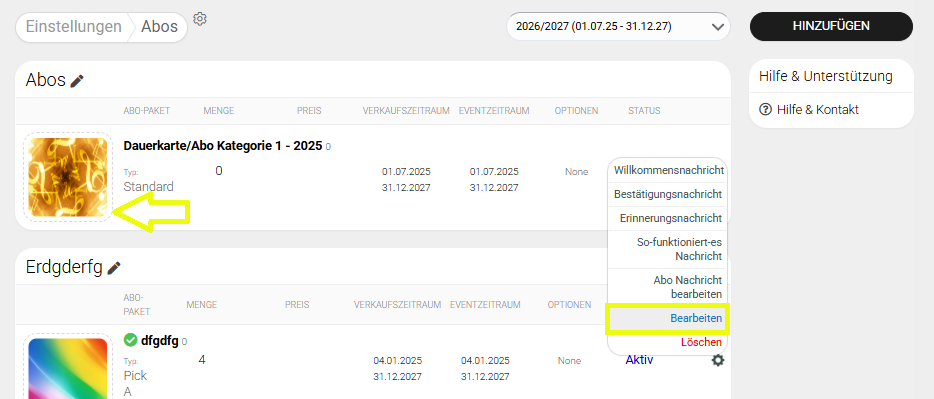 Du kannst nun weitere Einstellungen an dem Abo vornehmen. Ändere zum Beispiel das angezeigt Bild, indem Du auf den Platzhalter klickst und eine Grafik hinterlegst. Du kannst außerdem über das Zahnrad-Symbol u.a. die Willkommens- oder Erinnerungsnachricht für dieses Abo individualisieren. Falls Du wissen willst, wie Du diverse Nachrichten für alle Abos hinterlegen kannst, dann hilft Dir unser Blogartikel Grundlagen und Basiseinstellungen für Abonnements und Dauerkarten. Nachfolgend werden weitere Einstellungen zu den Abo-Modalitäten erklärt.