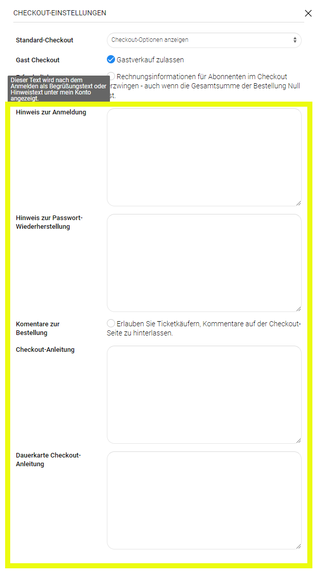 Gastverkauf zulassen: Falls deaktiviert, können Kunden nur nach Registrierung bestellen. Du kannst den Gastverkauf auch für einzelne Veranstaltungen ausschalten. (Global)