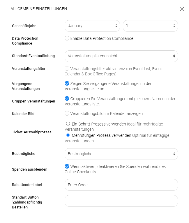 Konfiguriere, wie Kunden ihre Tickets auswählen und den Bestellvorgang abschließen, unter Einstellungen >> Veranstaltungen >> Veranstaltungseinstellungen >> Checkout Einstellungen