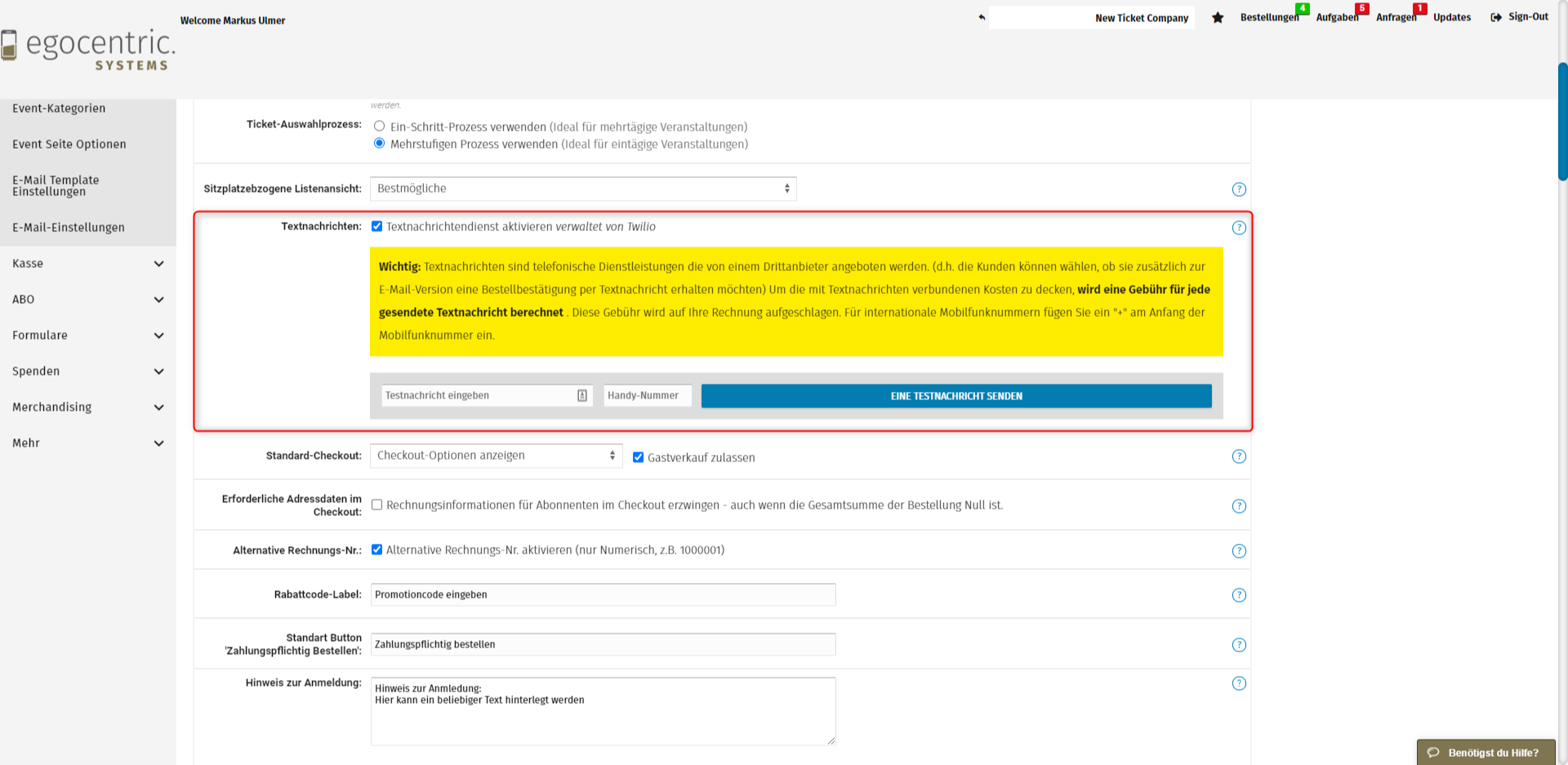 Für die Aktivierung navigiere zu "Einstellungen" >> "Veranstaltungen" >> "Veranstaltungseinstellungen" und aktiviere die Checkbox "Textnachrichten". Mit vorgenommener Aktivierung können Kunden die Bestellbestätigung als Textnachricht erhalten. Zusätzlich kannst Du die weitere Kommunikation mit Deinen Kunden ebenfalls als Textnachricht umsetzen. Ein paar Beispiele: