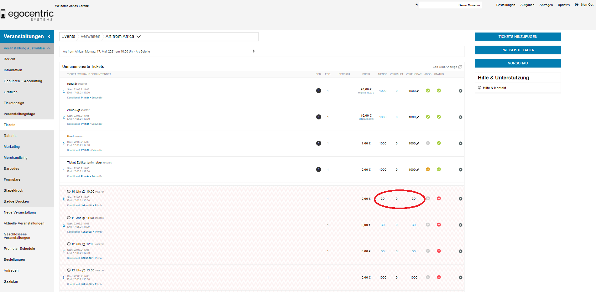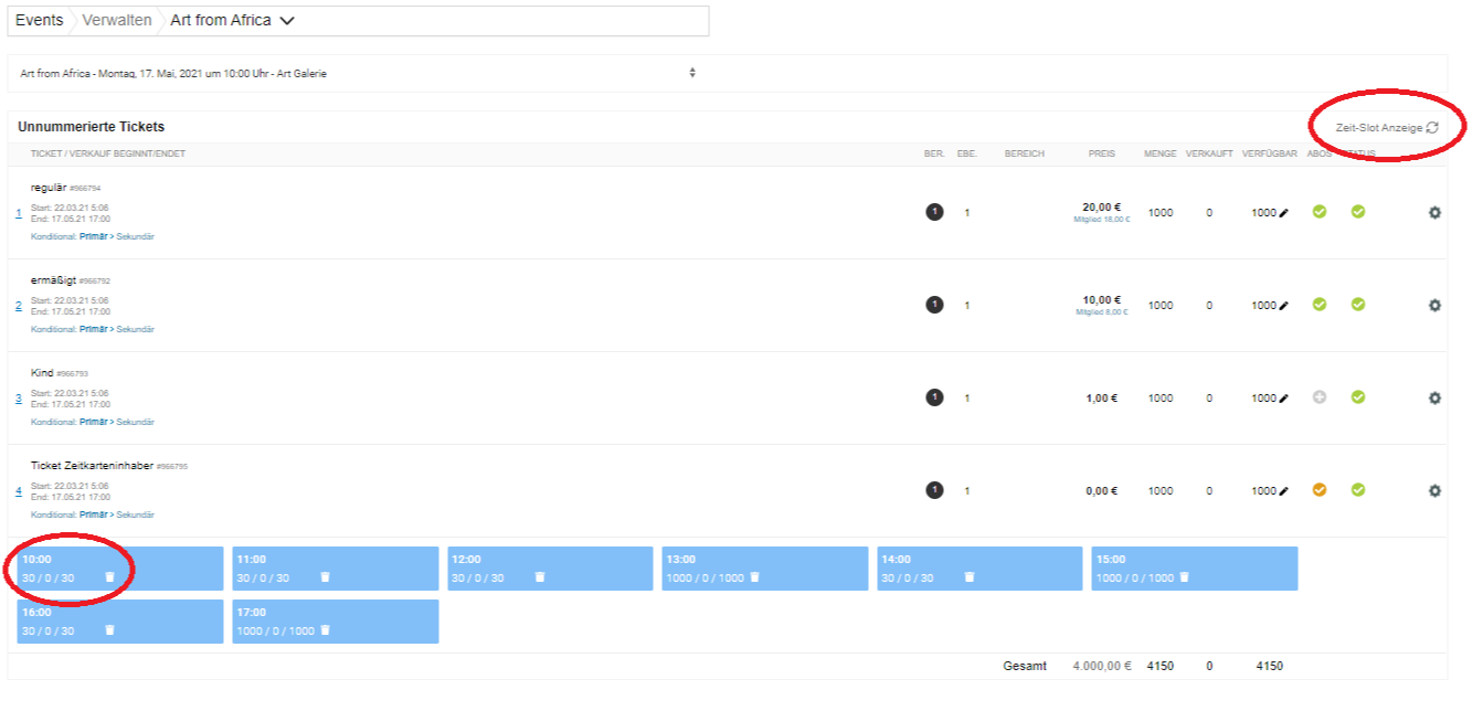 Nun erhältst du eine Übersicht über die Gesamtmenge der Tickets, die verkauften und die noch verfügbaren Tickets (siehe Bild unten).
