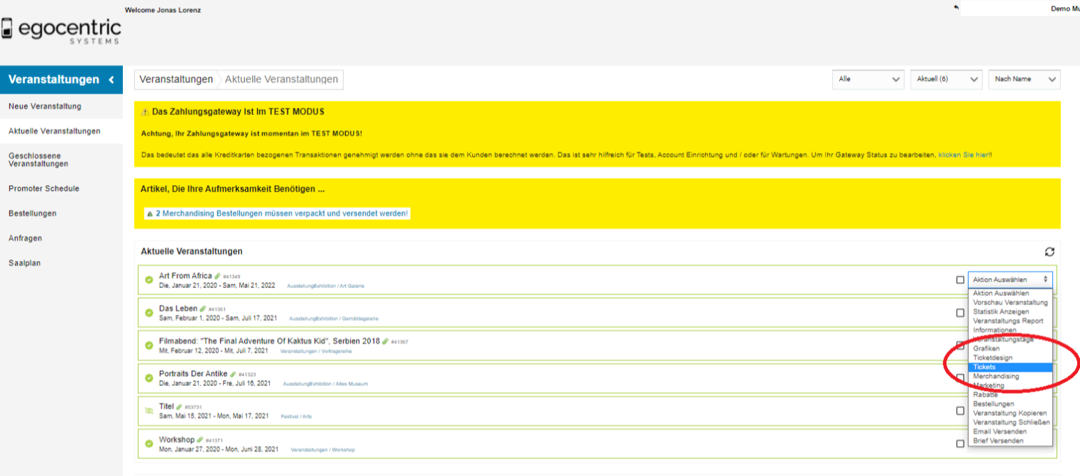 Hierzu geht du auf "Veranstaltungen->Aktuelle Veranstaltungen". Jetzt wählst du bei der gewünschten Veranstaltung rechts im Dropdown "Tickets" aus (siehe Bild unten).