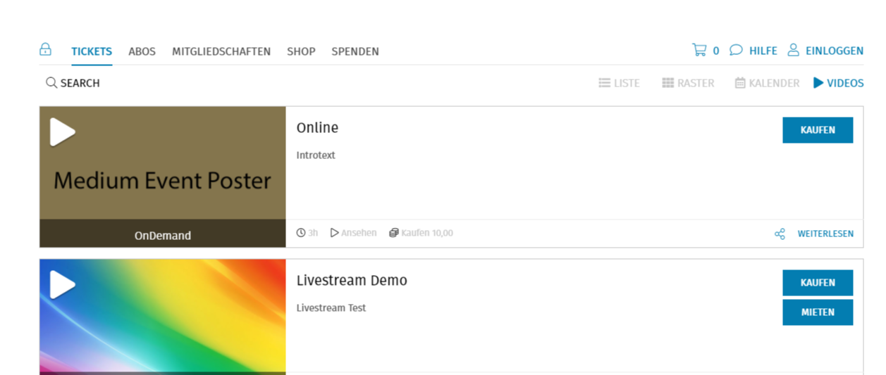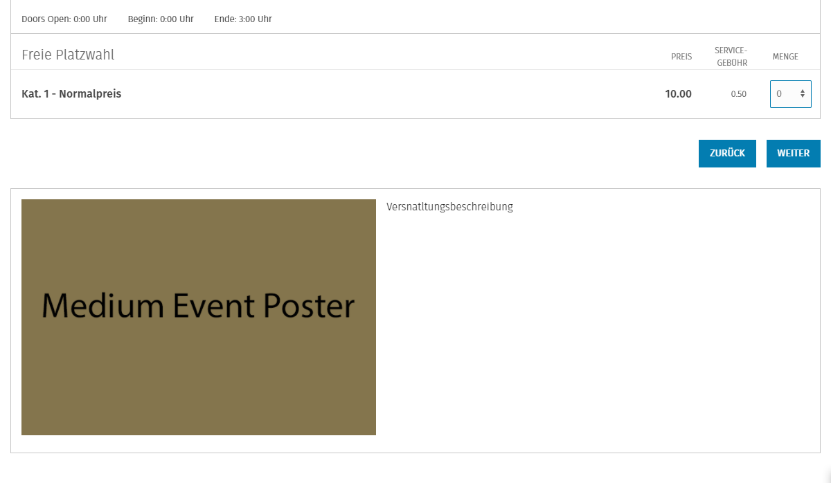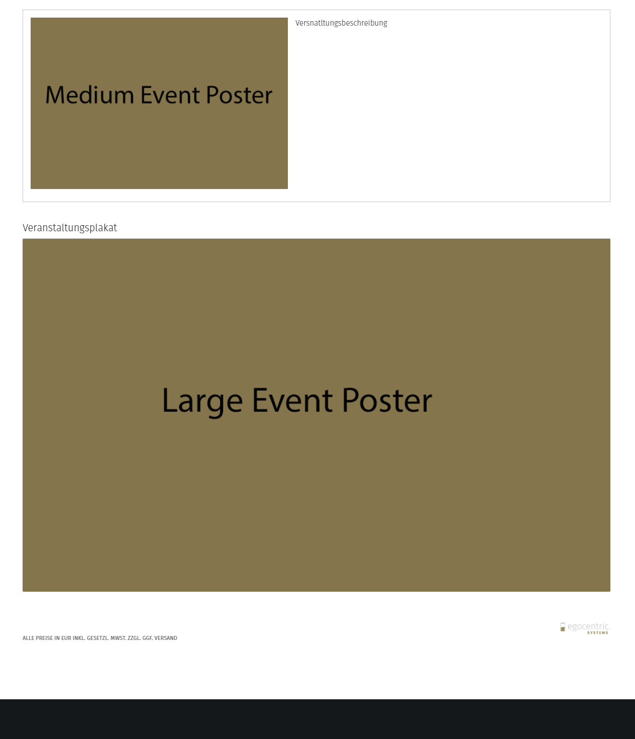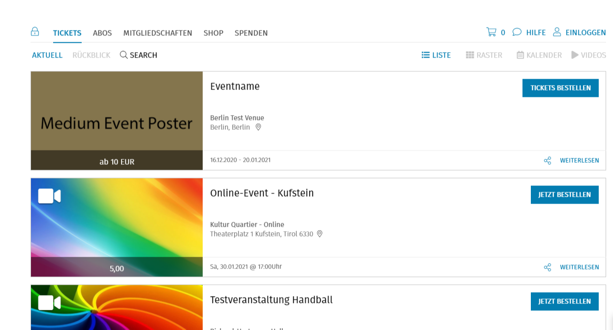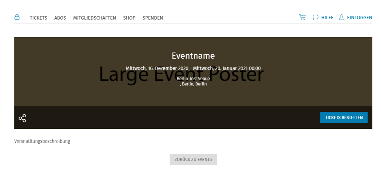 Das Medium Event Poster wird auf Veranstaltungsauswahlseite (Liste- und Rasteransicht sowie auf der Videoseite) dargestellt. Des Weiteren wird dieses auch auf der Veranstaltungsseite unterhalb der Ticketauswahl angezeigt.