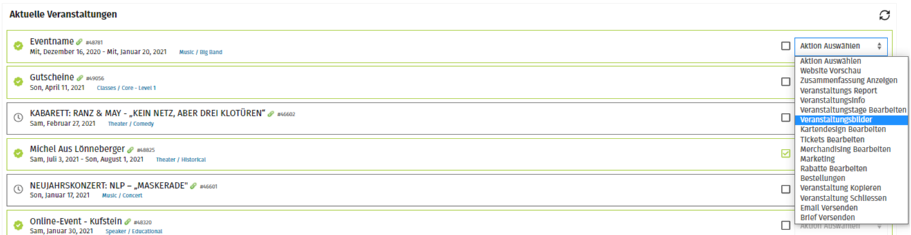 Gehe zu Veranstaltungen und suche nach der Veranstaltung, die du bearbeiten möchtest. Wähle dann bei der Veranstaltung bei Aktion Auswählen --> Veranstaltungsbilder aus.