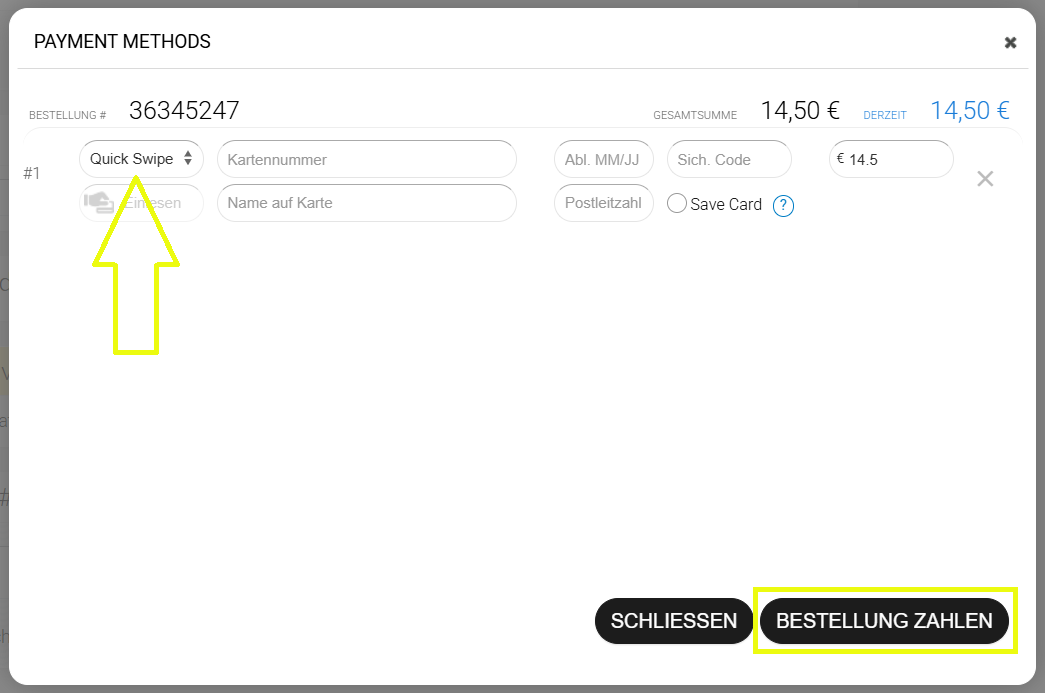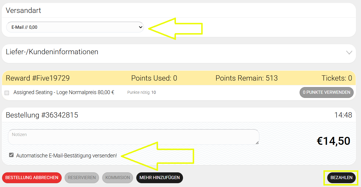 Führe wie gewohnt den Bezahlvorgang durch und bestätige die Aktion, indem du auf "Bestellung zahlen" klickst und die gewünschte Zahlart auswählst. Dein Kunde erhält nun je nach Zahlart eine Rechnung oder direkt eine Bestätigung für die Buchung seiner neuen Tickets. Die Tickets für die alten Sitzplätze sind storniert und die Zugangscodes somit ungültig.