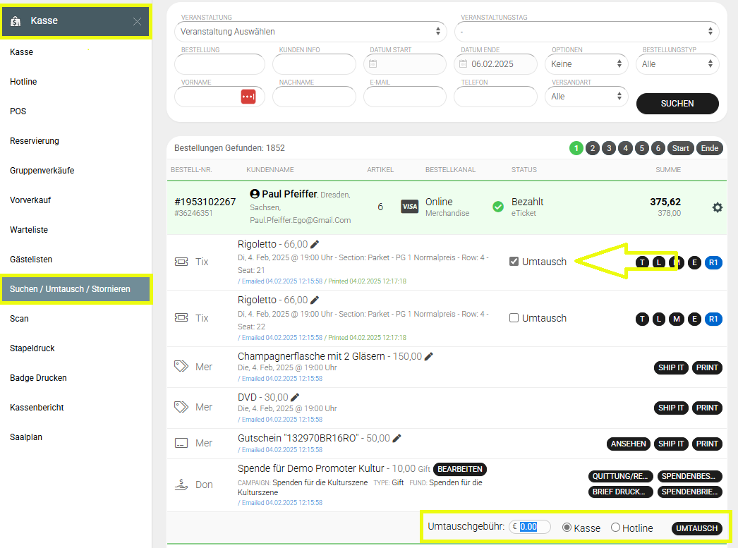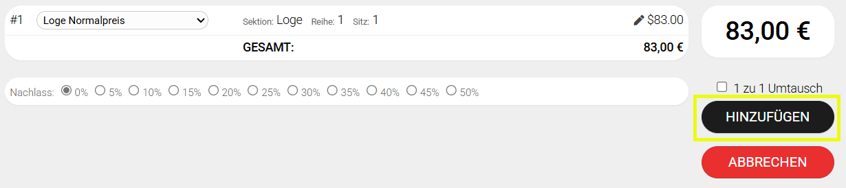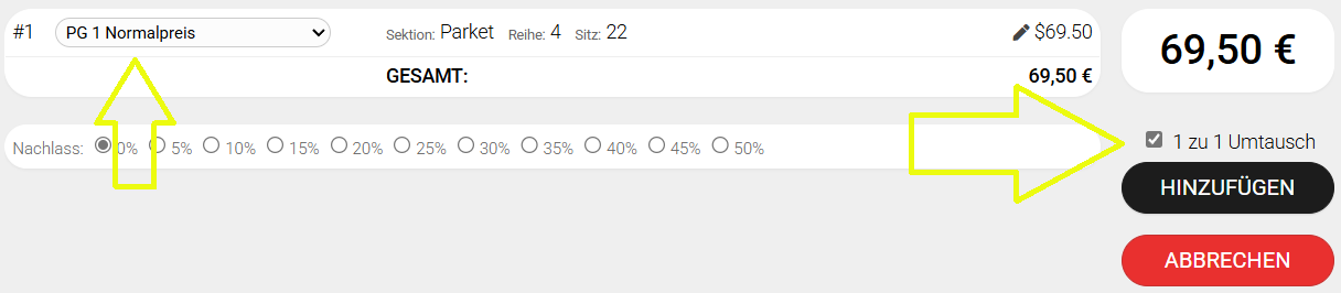 - 1 zu 1 Umtausch: Tickets werden ausgewechselt, ohne mögliche Differenzbeträge zu begleichen. Wird nur in Kulanzfällen oder bei einfacher Sitzplatzänderung empfohlen.