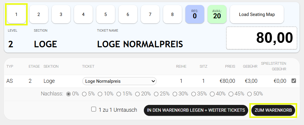 1. Wähle in der oberen Zeile die Veranstaltung und den Veranstaltungstag der neuen Tickets aus.