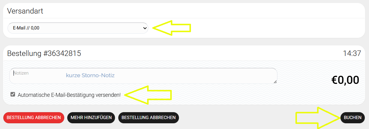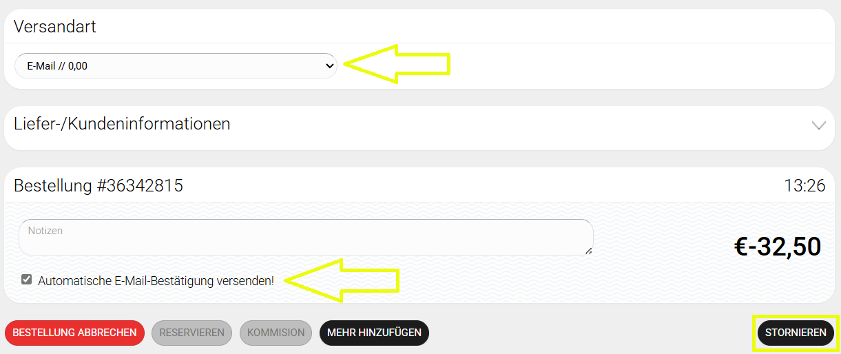 5. Scrolle nach unten und überprüfe die Versandart. Vergiss nicht, einen Haken für die automatische E-Mail Bestätigung zu setzen! Füge eine kurze Notiz über den Stornogrund hinzu.