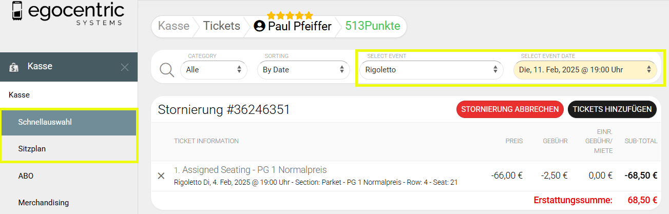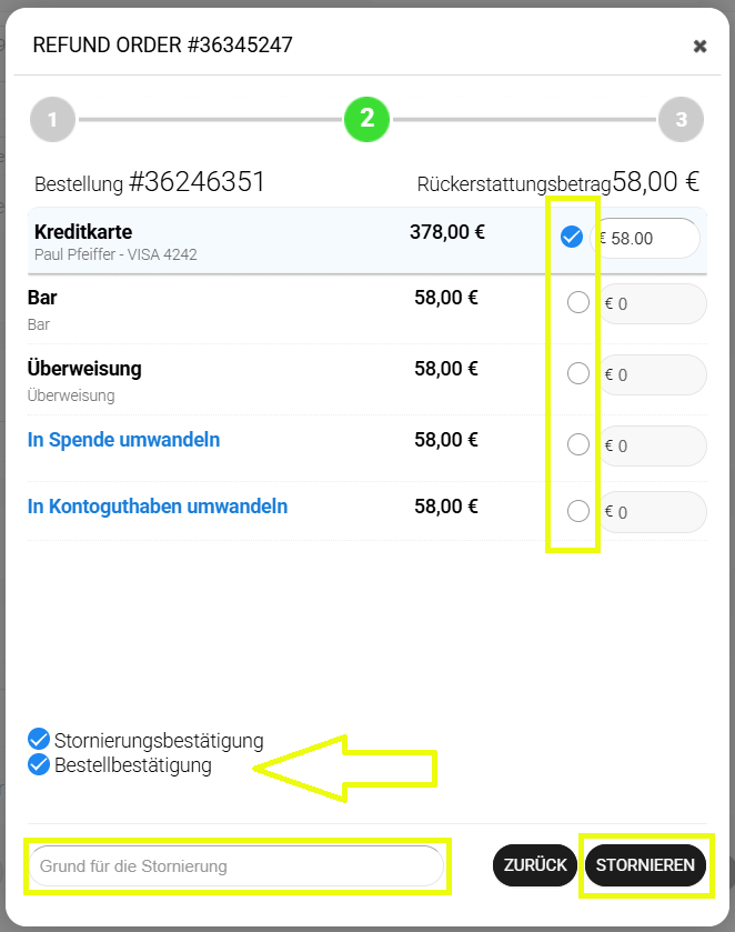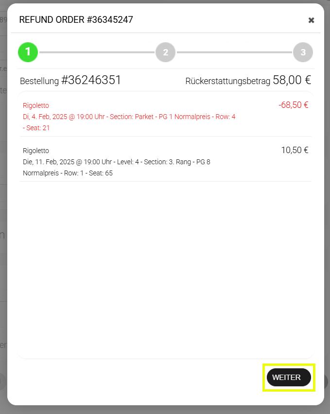 Führe wie gewohnt den Rückerstattungsvorgang durch und bestätige die Aktion, indem du auf "Weiter" klickst. Wähle anschließend die Transaktionsmethode und vergiss nicht, den Haken für die Bestellbestätigung zu setzen. Schließe den Vorgang ab, indem Du auf "Stornieren" klickst. Dein Kunde erhält nun eine Bestätigung für die Buchung seiner neuen Tickets. Die Tickets für die alten Sitzplätze sind storniert und die Zugangscodes somit ungültig.