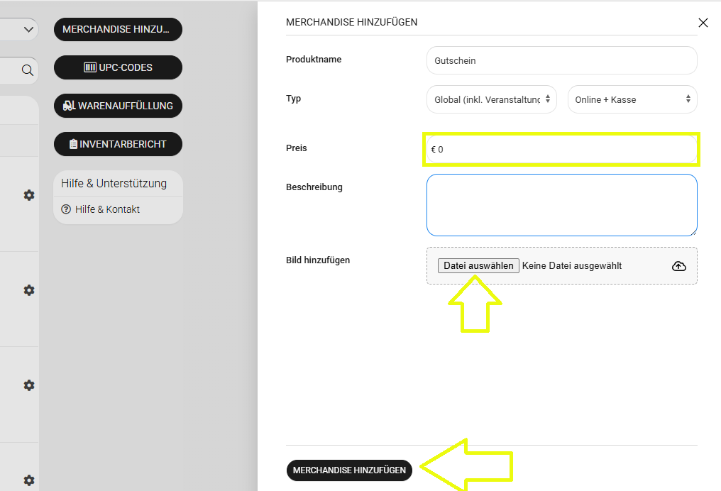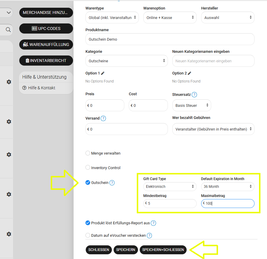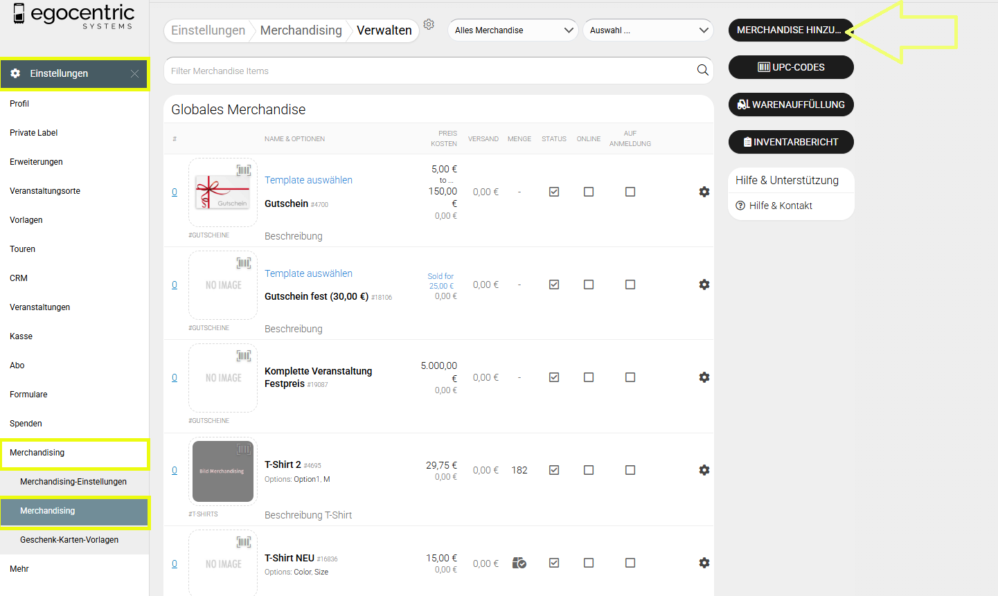 - füge Gutscheine einfach als Merchandise-Artikel hinzu