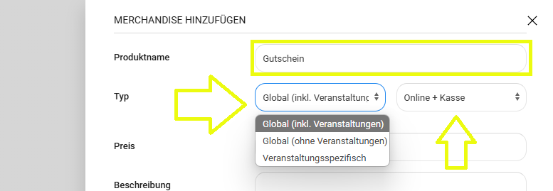 6. Wähle aus, ob der Gutschein online und an der Kasse oder nur an der Kasse gekauft werden kann.