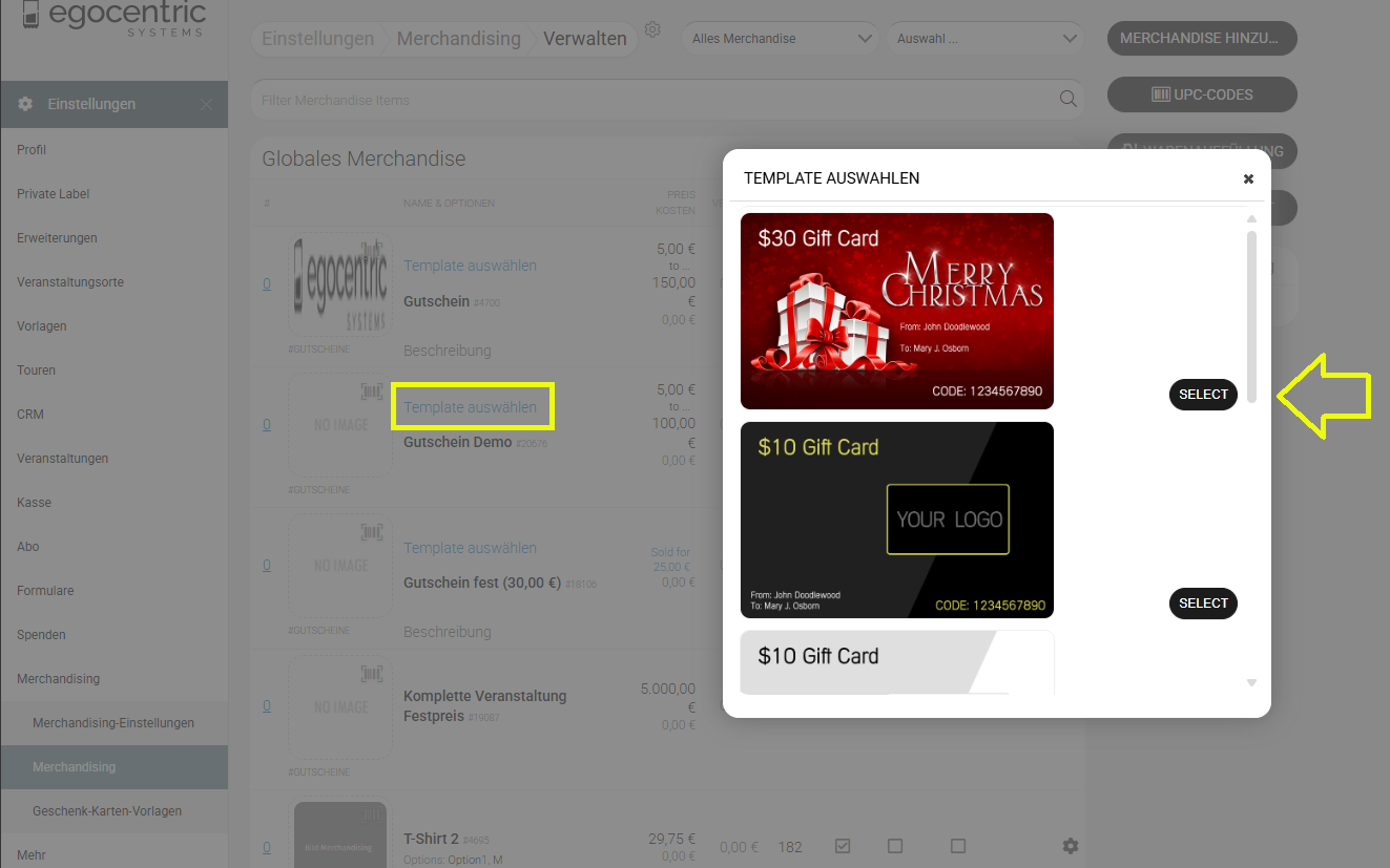 8. Wechsele im Merchandise-Menü in den Unterpunkt "Merchandise" und wähle Deine Vorlage für Deinen Gutschein wie zuvor beschrieben.