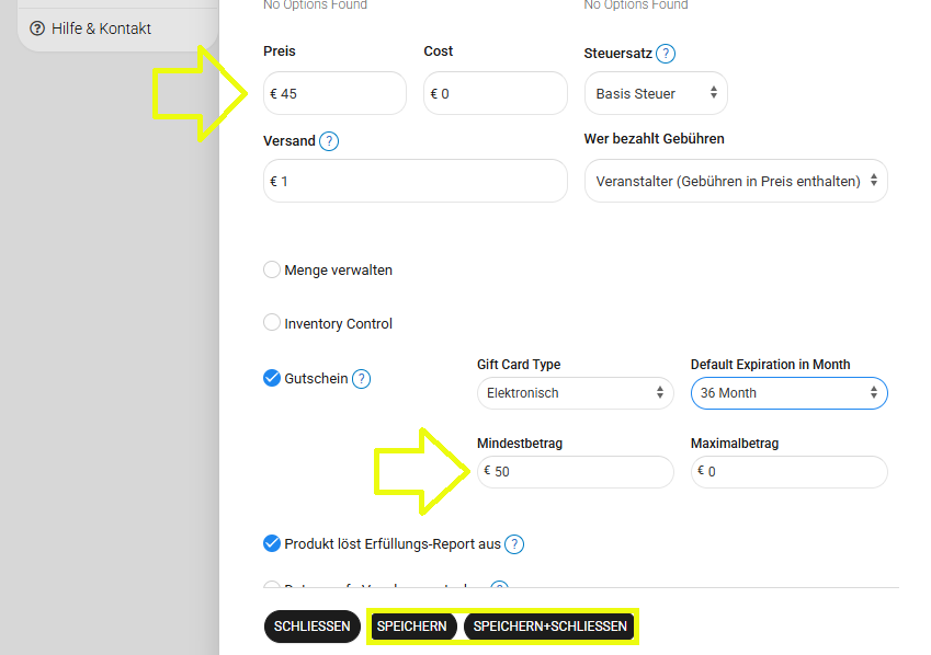 7. Lege die Preisspanne fest, innerhalb derer Deine Kunden Gutscheine buchen können. Trage dafür unter "Minimalbetrag" das untere Ende der Spanne und unter "Maximalbetrag" den höchstmöglichen Betrag ein.
