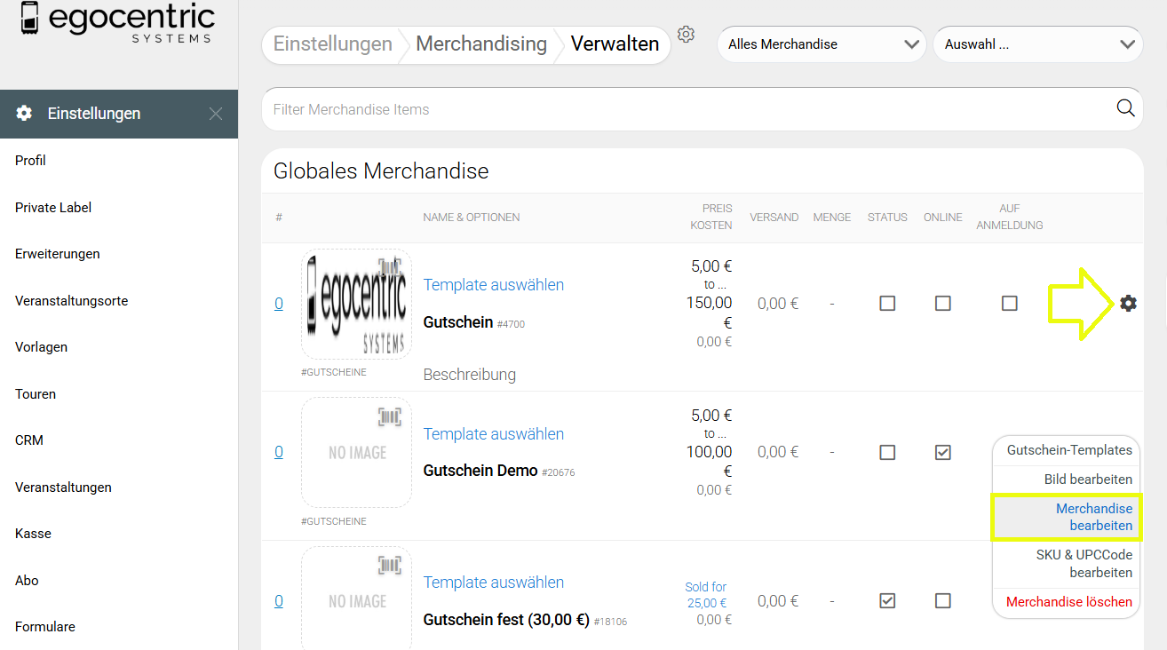 2. Wähle „Einstellungen“ → „Merchandising“ → "Geschenk-Karten-Vorlage".