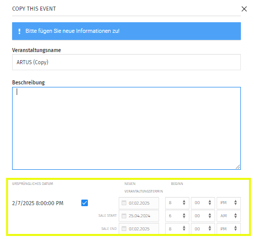 - Wähle das gewünschte Event aus, passe Datum, Uhrzeit und weitere Details an und entscheide, ob Texte von der Originalveranstaltung übernommen werden sollen.