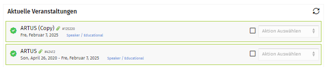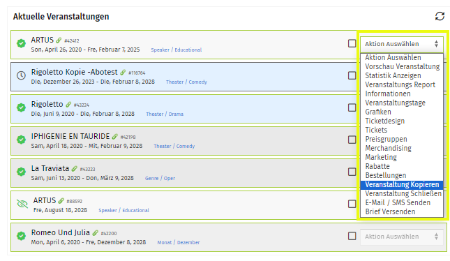 Hier findest du all deine aktuellen und aktiven Veranstaltungen. Wenn du eine Veranstaltung kopieren möchtest, klickst du links bei deiner Veranstaltung auf Aktion Auswählen.