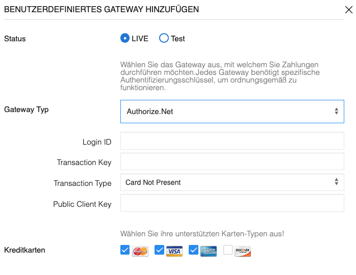 - PayPal: Die nötigen Daten, um das Gateway einzurichten, bekommst du von PayPal. Hier sind sowohl Test als auch Live Buchungen möglich.