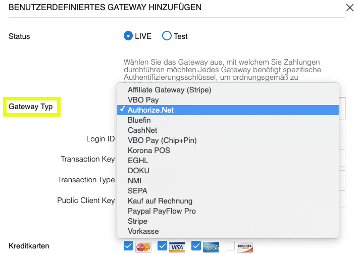 Nun öffnet sich ein Fenster, sodass der gewünschte Gateway Typ ausgewählt und die entsprechenden Informationen hinterlegt werden können.