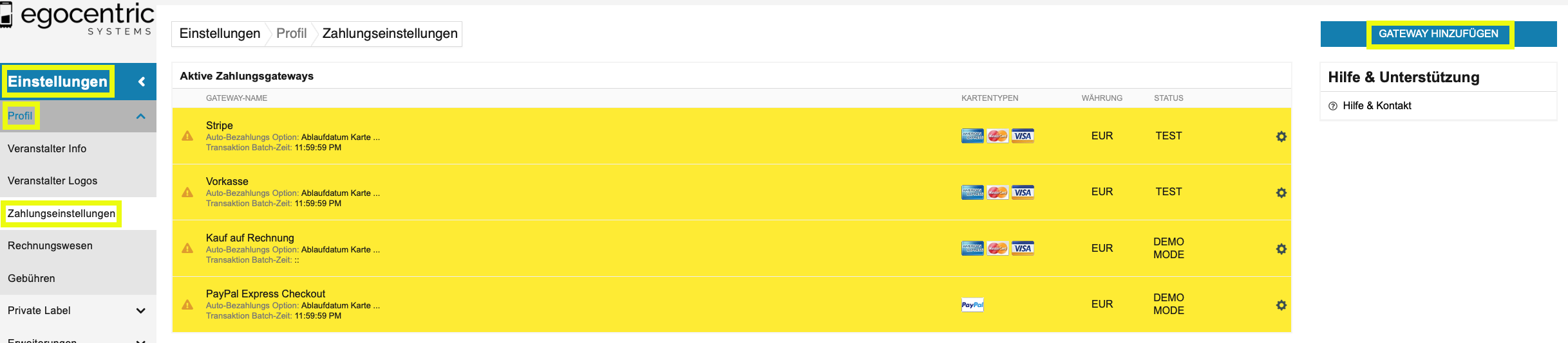 Unter Einstellungen --> Profil findest du den Menüpunkt Zahlungseinstellungen. Hier kannst du bestehende Payment-Gateways bearbeiten (Zahnrad). Außerdem kannst neue Gateways hinzufügen, indem du oben rechts auf den blauen Button Gateway hinzufügen klickst.