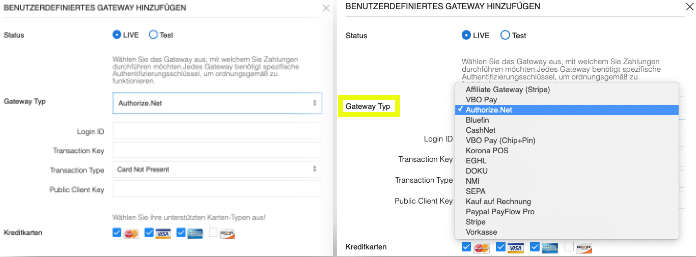 Nun öffnet sich ein Fenster, sodass der gewünschte Gateway Typ ausgewählt und die entsprechenden Informationen hinterlegt werden können.