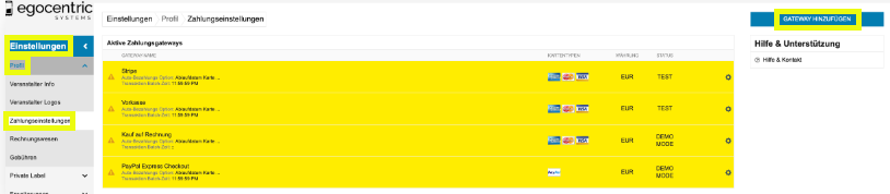 Unter Einstellungen --> Profil findest du den Menüpunkt Zahlungseinstellungen. Hier kannst du bestehende Payment-Gateways bearbeiten (Zahnrad).