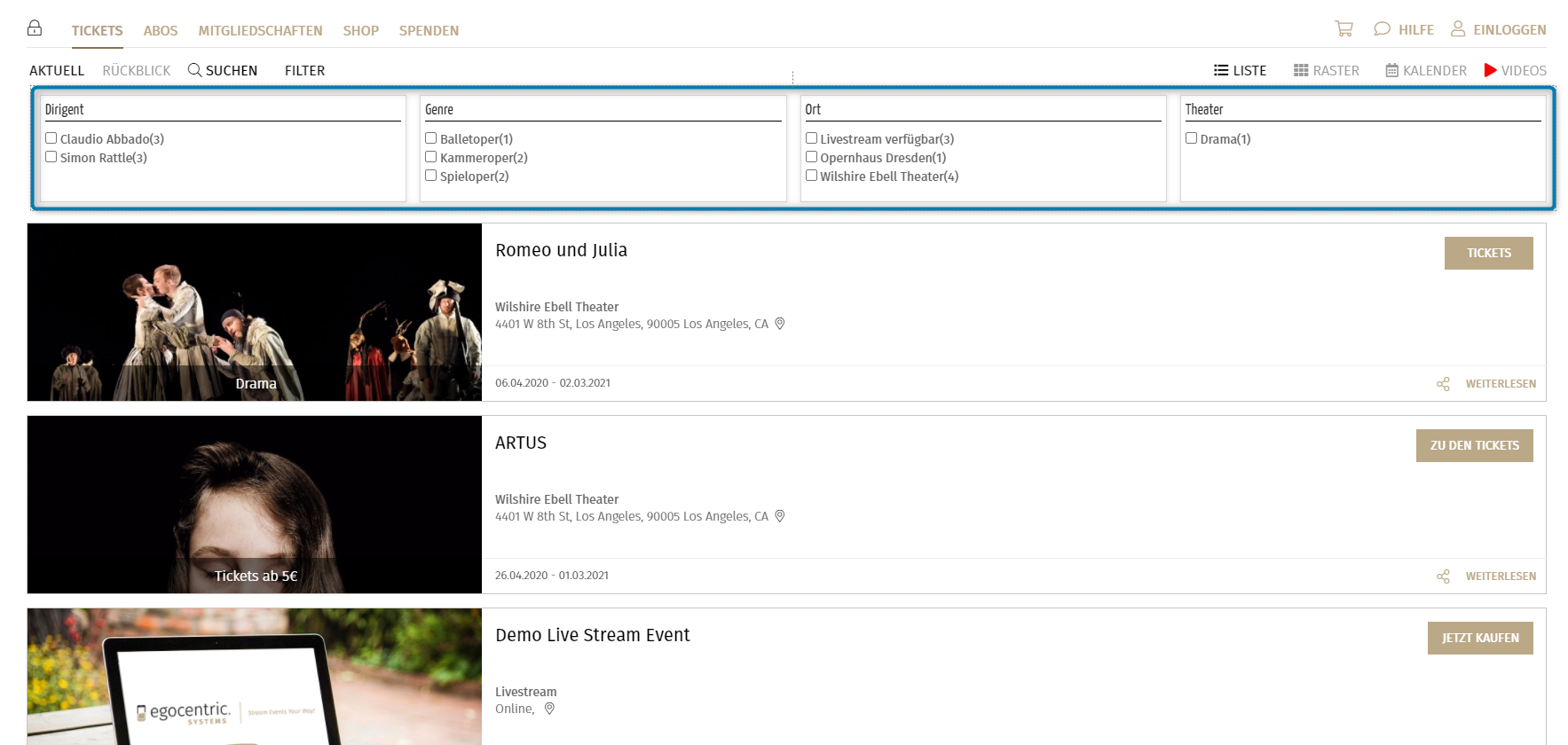 Die Einrichtung der Filter ist nun abgeschlossen und die Filter werden nun in deinem Ticketshop angezeigt.